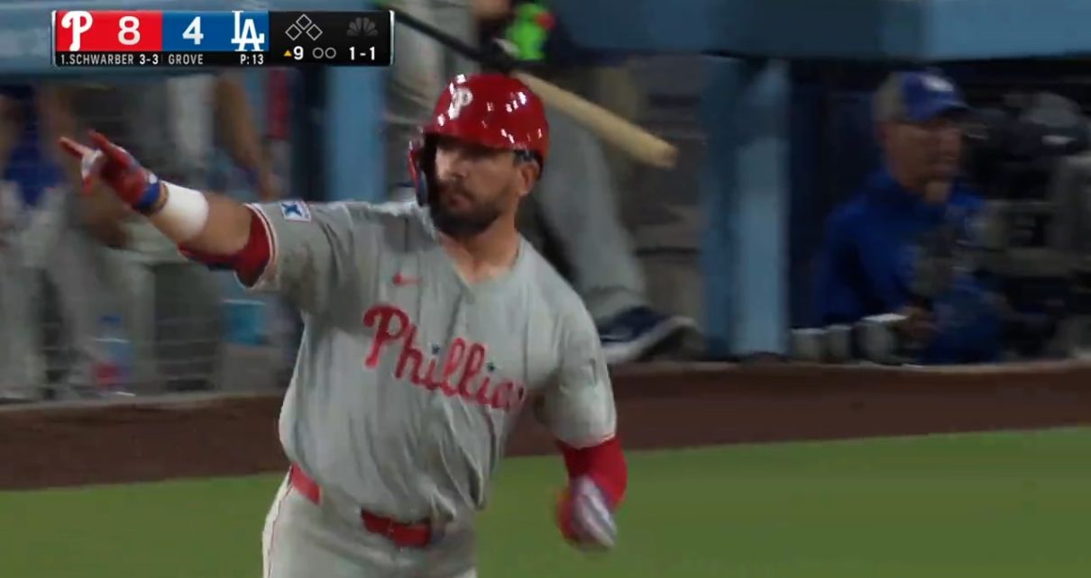 Kyle Schwarber his his third home run of the night to extend the Philadelphia Phillies’ lead over the the Los Angeles Dodgers.