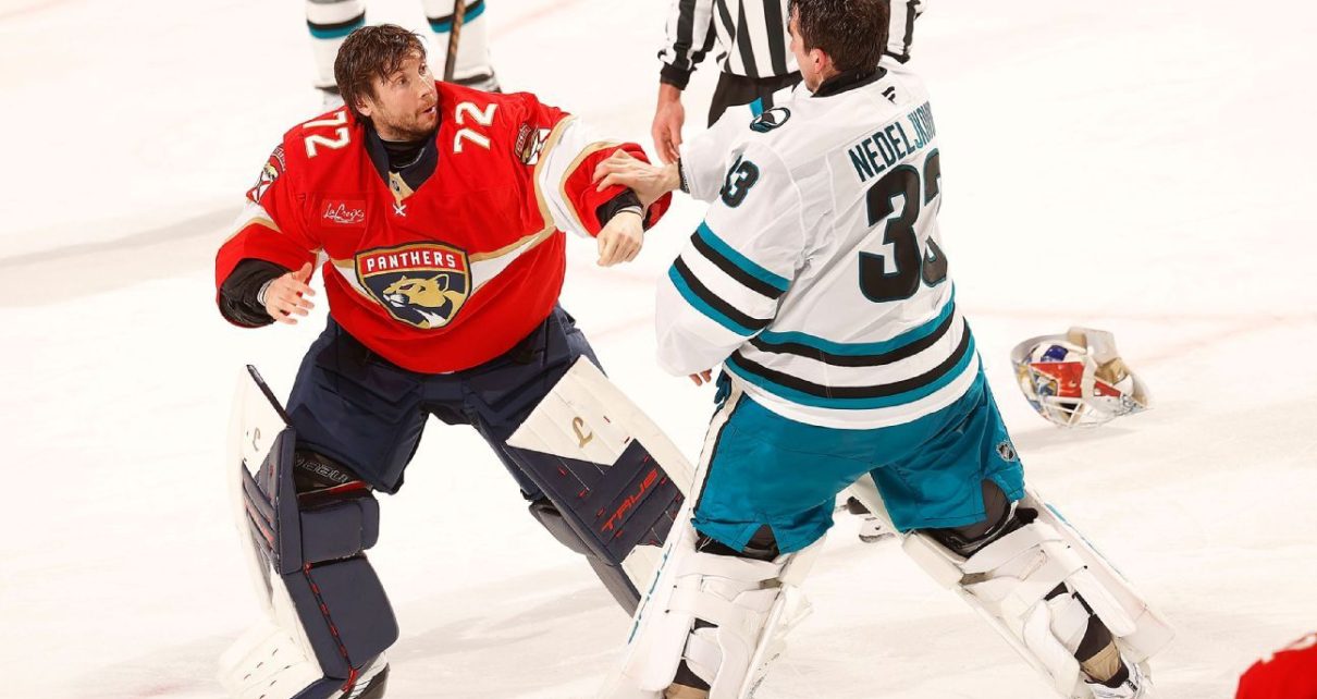 A goalie fight broke out with 14 minutes left in a game Monday night between the Panthers and Sharks that had become increasingly chippy with post-whistle pushing and shoving.